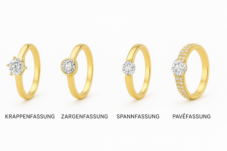 - Klassischer Stil, bei dem der Edelstein mit kleinen Metallkrallen gehalten wird